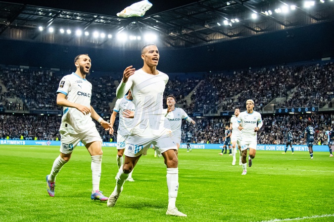 Joie des joueurs de l'OM aprés le but de Mason Greenwood (OM) - Match de Ligue 1 McDonalds, AC Le Havre contre l'Olympique de Marseille (1-3) au Havre le 10 mai 2025. Ligue 1 McDonalds match, AC Le Havre against Olympique de Marseille (1-3) in Le Havre on May 10, 2025.