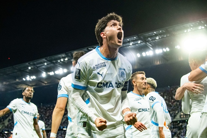 Joie des joueurs de l'OM aprés le but de Mason Greenwood (OM) - Match de Ligue 1 McDonalds, AC Le Havre contre l'Olympique de Marseille (1-3) au Havre le 10 mai 2025. Ligue 1 McDonalds match, AC Le Havre against Olympique de Marseille (1-3) in Le Havre on May 10, 2025.