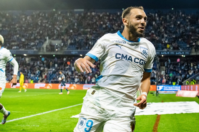 Joie des joueurs de l'OM aprés le second but de Amine Gouiri (OM) - Match de Ligue 1 McDonalds, AC Le Havre contre l'Olympique de Marseille (1-3) au Havre le 10 mai 2025. Ligue 1 McDonalds match, AC Le Havre against Olympique de Marseille (1-3) in Le Havre on May 10, 2025.