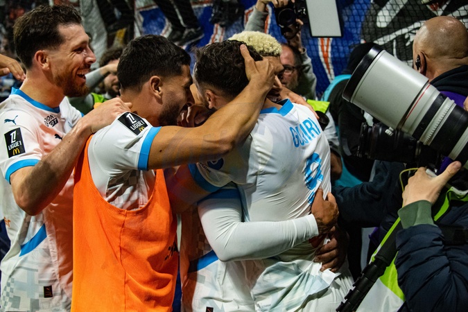 Joie des joueurs de l'OM aprés le second but de Amine Gouiri (OM) - Match de Ligue 1 McDonalds, AC Le Havre contre l'Olympique de Marseille (1-3) au Havre le 10 mai 2025. Ligue 1 McDonalds match, AC Le Havre against Olympique de Marseille (1-3) in Le Havre on May 10, 2025.