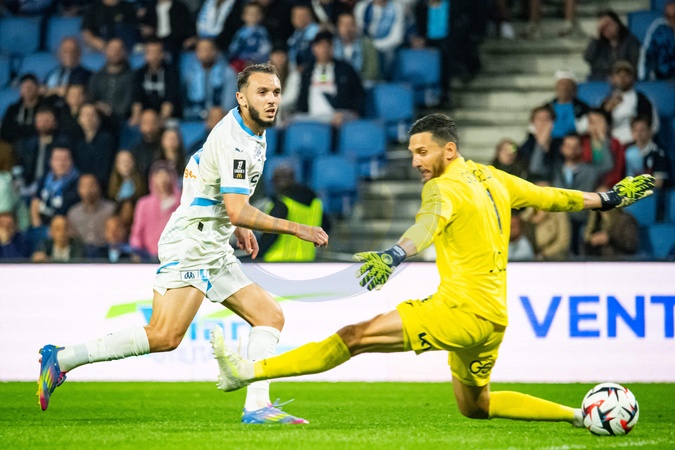 Amine Gouiri (OM) Mathieu Gorgelin (AC Le Havre) - Match de Ligue 1 McDonalds, AC Le Havre contre l'Olympique de Marseille (1-3) au Havre le 10 mai 2025. Ligue 1 McDonalds match, AC Le Havre against Olympique de Marseille (1-3) in Le Havre on May 10, 2025.
