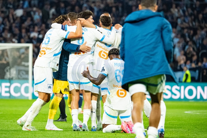 Joie des Marseillais apres la qualification en Ligue des Champions - Match de Ligue 1 McDonalds, AC Le Havre contre l'Olympique de Marseille (1-3) au Havre le 10 mai 2025. Ligue 1 McDonalds match, AC Le Havre against Olympique de Marseille (1-3) in Le Havre on May 10, 2025.
