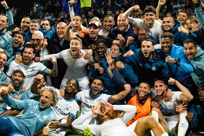 Joie des Marseillais apres la qualification en Ligue des Champions - Match de Ligue 1 McDonalds, AC Le Havre contre l'Olympique de Marseille (1-3) au Havre le 10 mai 2025. Ligue 1 McDonalds match, AC Le Havre against Olympique de Marseille (1-3) in Le Havre on May 10, 2025.