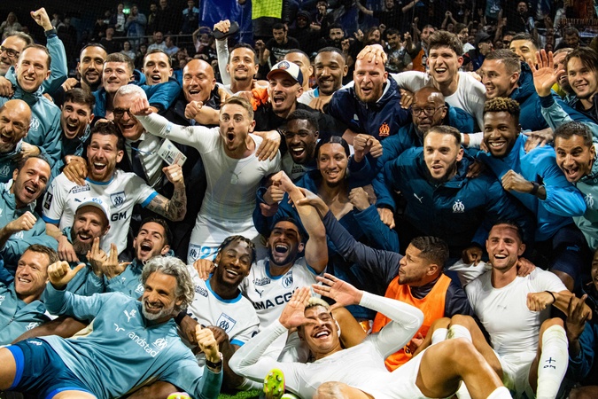 Joie des Marseillais apres la qualification en Ligue des Champions - Match de Ligue 1 McDonalds, AC Le Havre contre l'Olympique de Marseille (1-3) au Havre le 10 mai 2025. Ligue 1 McDonalds match, AC Le Havre against Olympique de Marseille (1-3) in Le Havre on May 10, 2025.