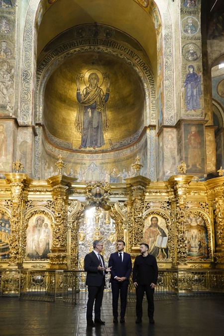 Emmanuel Macron, Keir Starmer, et Voloydmyr Zelensky visitent le Mur des Héros de la Nation et la cathédrale Sainte-Sophie à Kie