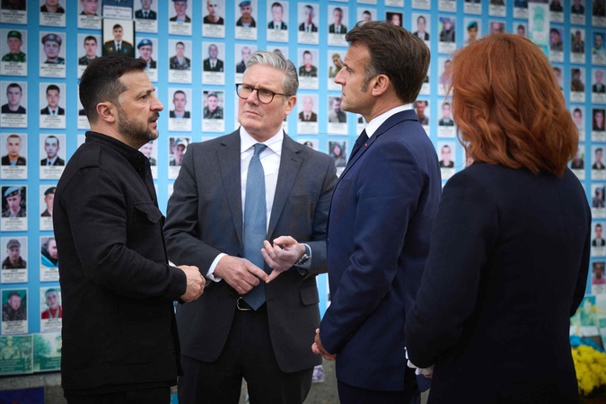 Déplacement d'Emmanuel Macron, Friedrich Merz, Keir Starmer, Donald Tusk et Voloydmyr Zelensky pour participer à la conférence de la Coalition des Volontaires à Kiev, le 10 mai 2025. A l'issue de celle-ci, Emmanuel Macron, Keir Starmer, et Voloydmyr Zelensky ont visité le Mur des Héros de la Nation et la cathédrale Sainte-Sophie. Lors de cette visite officielle, les quatre chefs d'État et de gouvernement ont plaidé en faveur d'un cessez-le-feu de 30 jours dans la guerre russo-ukrainienne. Emmanuel Macron, Friedrich Merz, Keir Starmer, Donald Tusk, and Voloydmyr Zelensky travel to attend the Coalition of the Willing conference in Kyiv on May 10, 2025. Following the conference, Emmanuel Macron, Keir Starmer, and Voloydmyr Zelensky visited the Wall of the Nation's Heroes and Saint Sophia Cathedral. During this official visit, the four heads of state and government called for a 30-day ceasefire in the Russo-Ukrainian war.