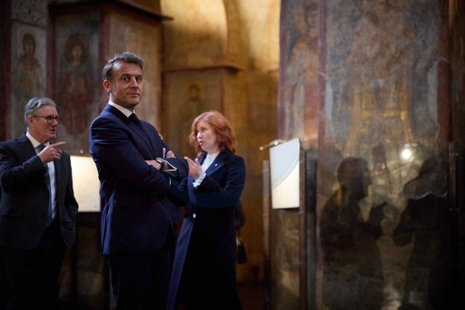 Déplacement d'Emmanuel Macron, Friedrich Merz, Keir Starmer, Donald Tusk et Voloydmyr Zelensky pour participer à la conférence de la Coalition des Volontaires à Kiev, le 10 mai 2025. A l'issue de celle-ci, Emmanuel Macron, Keir Starmer, et Voloydmyr Zelensky ont visité le Mur des Héros de la Nation et la cathédrale Sainte-Sophie. Lors de cette visite officielle, les quatre chefs d'État et de gouvernement ont plaidé en faveur d'un cessez-le-feu de 30 jours dans la guerre russo-ukrainienne. Emmanuel Macron, Friedrich Merz, Keir Starmer, Donald Tusk, and Voloydmyr Zelensky travel to attend the Coalition of the Willing conference in Kyiv on May 10, 2025. Following the conference, Emmanuel Macron, Keir Starmer, and Voloydmyr Zelensky visited the Wall of the Nation's Heroes and Saint Sophia Cathedral. During this official visit, the four heads of state and government called for a 30-day ceasefire in the Russo-Ukrainian war.