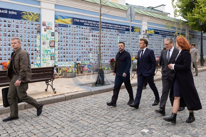 Déplacement d'Emmanuel Macron, Friedrich Merz, Keir Starmer, Donald Tusk et Voloydmyr Zelensky pour participer à la conférence de la Coalition des Volontaires à Kiev, le 10 mai 2025. A l'issue de celle-ci, Emmanuel Macron, Keir Starmer, et Voloydmyr Zelensky ont visité le Mur des Héros de la Nation et la cathédrale Sainte-Sophie. Lors de cette visite officielle, les quatre chefs d'État et de gouvernement ont plaidé en faveur d'un cessez-le-feu de 30 jours dans la guerre russo-ukrainienne. Emmanuel Macron, Friedrich Merz, Keir Starmer, Donald Tusk, and Voloydmyr Zelensky travel to attend the Coalition of the Willing conference in Kyiv on May 10, 2025. Following the conference, Emmanuel Macron, Keir Starmer, and Voloydmyr Zelensky visited the Wall of the Nation's Heroes and Saint Sophia Cathedral. During this official visit, the four heads of state and government called for a 30-day ceasefire in the Russo-Ukrainian war.