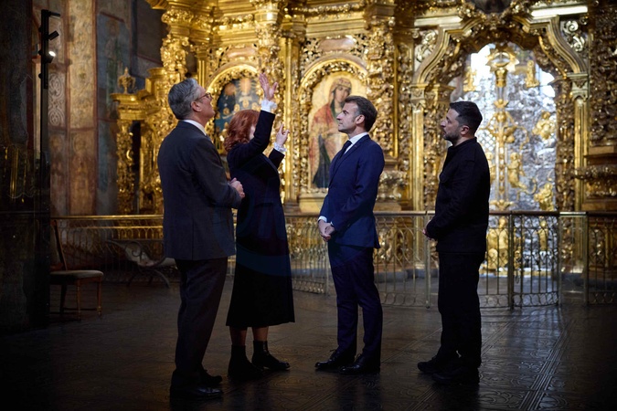 Déplacement d'Emmanuel Macron, Friedrich Merz, Keir Starmer, Donald Tusk et Voloydmyr Zelensky pour participer à la conférence de la Coalition des Volontaires à Kiev, le 10 mai 2025. A l'issue de celle-ci, Emmanuel Macron, Keir Starmer, et Voloydmyr Zelensky ont visité le Mur des Héros de la Nation et la cathédrale Sainte-Sophie. Lors de cette visite officielle, les quatre chefs d'État et de gouvernement ont plaidé en faveur d'un cessez-le-feu de 30 jours dans la guerre russo-ukrainienne. Emmanuel Macron, Friedrich Merz, Keir Starmer, Donald Tusk, and Voloydmyr Zelensky travel to attend the Coalition of the Willing conference in Kyiv on May 10, 2025. Following the conference, Emmanuel Macron, Keir Starmer, and Voloydmyr Zelensky visited the Wall of the Nation's Heroes and Saint Sophia Cathedral. During this official visit, the four heads of state and government called for a 30-day ceasefire in the Russo-Ukrainian war.