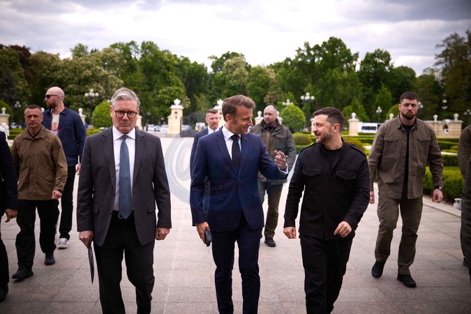 Déplacement d'Emmanuel Macron, Friedrich Merz, Keir Starmer, Donald Tusk et Voloydmyr Zelensky pour participer à la conférence de la Coalition des Volontaires à Kiev, le 10 mai 2025. A l'issue de celle-ci, Emmanuel Macron, Keir Starmer, et Voloydmyr Zelensky ont visité le Mur des Héros de la Nation et la cathédrale Sainte-Sophie. Lors de cette visite officielle, les quatre chefs d'État et de gouvernement ont plaidé en faveur d'un cessez-le-feu de 30 jours dans la guerre russo-ukrainienne. Emmanuel Macron, Friedrich Merz, Keir Starmer, Donald Tusk, and Voloydmyr Zelensky travel to attend the Coalition of the Willing conference in Kyiv on May 10, 2025. Following the conference, Emmanuel Macron, Keir Starmer, and Voloydmyr Zelensky visited the Wall of the Nation's Heroes and Saint Sophia Cathedral. During this official visit, the four heads of state and government called for a 30-day ceasefire in the Russo-Ukrainian war.