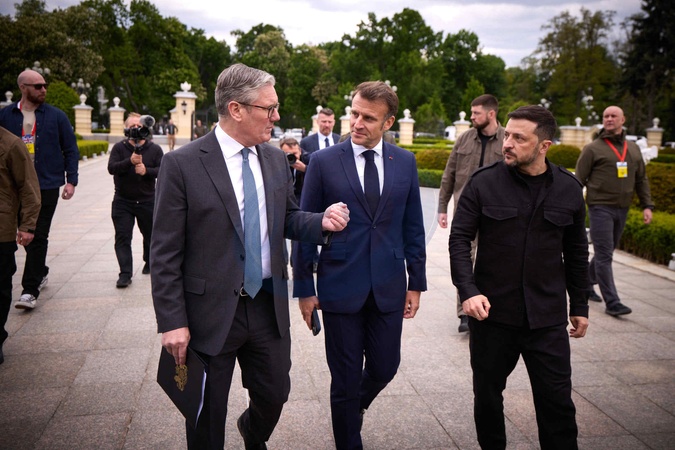 Déplacement d'Emmanuel Macron, Friedrich Merz, Keir Starmer, Donald Tusk et Voloydmyr Zelensky pour participer à la conférence de la Coalition des Volontaires à Kiev, le 10 mai 2025. A l'issue de celle-ci, Emmanuel Macron, Keir Starmer, et Voloydmyr Zelensky ont visité le Mur des Héros de la Nation et la cathédrale Sainte-Sophie. Lors de cette visite officielle, les quatre chefs d'État et de gouvernement ont plaidé en faveur d'un cessez-le-feu de 30 jours dans la guerre russo-ukrainienne. Emmanuel Macron, Friedrich Merz, Keir Starmer, Donald Tusk, and Voloydmyr Zelensky travel to attend the Coalition of the Willing conference in Kyiv on May 10, 2025. Following the conference, Emmanuel Macron, Keir Starmer, and Voloydmyr Zelensky visited the Wall of the Nation's Heroes and Saint Sophia Cathedral. During this official visit, the four heads of state and government called for a 30-day ceasefire in the Russo-Ukrainian war.