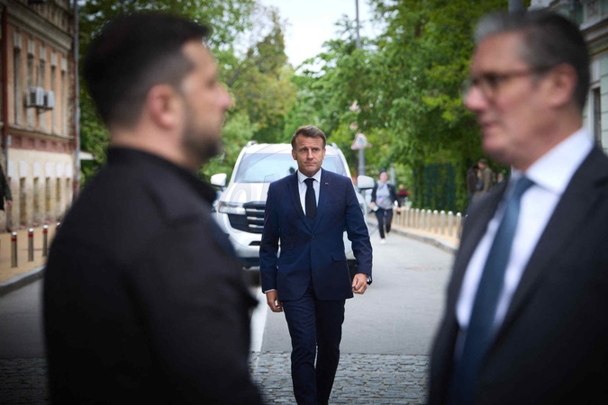 Déplacement d'Emmanuel Macron, Friedrich Merz, Keir Starmer, Donald Tusk et Voloydmyr Zelensky pour participer à la conférence de la Coalition des Volontaires à Kiev, le 10 mai 2025. A l'issue de celle-ci, Emmanuel Macron, Keir Starmer, et Voloydmyr Zelensky ont visité le Mur des Héros de la Nation et la cathédrale Sainte-Sophie. Lors de cette visite officielle, les quatre chefs d'État et de gouvernement ont plaidé en faveur d'un cessez-le-feu de 30 jours dans la guerre russo-ukrainienne. Emmanuel Macron, Friedrich Merz, Keir Starmer, Donald Tusk, and Voloydmyr Zelensky travel to attend the Coalition of the Willing conference in Kyiv on May 10, 2025. Following the conference, Emmanuel Macron, Keir Starmer, and Voloydmyr Zelensky visited the Wall of the Nation's Heroes and Saint Sophia Cathedral. During this official visit, the four heads of state and government called for a 30-day ceasefire in the Russo-Ukrainian war.
