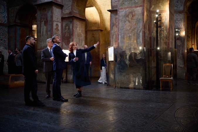 Déplacement d'Emmanuel Macron, Friedrich Merz, Keir Starmer, Donald Tusk et Voloydmyr Zelensky pour participer à la conférence de la Coalition des Volontaires à Kiev, le 10 mai 2025. A l'issue de celle-ci, Emmanuel Macron, Keir Starmer, et Voloydmyr Zelensky ont visité le Mur des Héros de la Nation et la cathédrale Sainte-Sophie. Lors de cette visite officielle, les quatre chefs d'État et de gouvernement ont plaidé en faveur d'un cessez-le-feu de 30 jours dans la guerre russo-ukrainienne. Emmanuel Macron, Friedrich Merz, Keir Starmer, Donald Tusk, and Voloydmyr Zelensky travel to attend the Coalition of the Willing conference in Kyiv on May 10, 2025. Following the conference, Emmanuel Macron, Keir Starmer, and Voloydmyr Zelensky visited the Wall of the Nation's Heroes and Saint Sophia Cathedral. During this official visit, the four heads of state and government called for a 30-day ceasefire in the Russo-Ukrainian war.