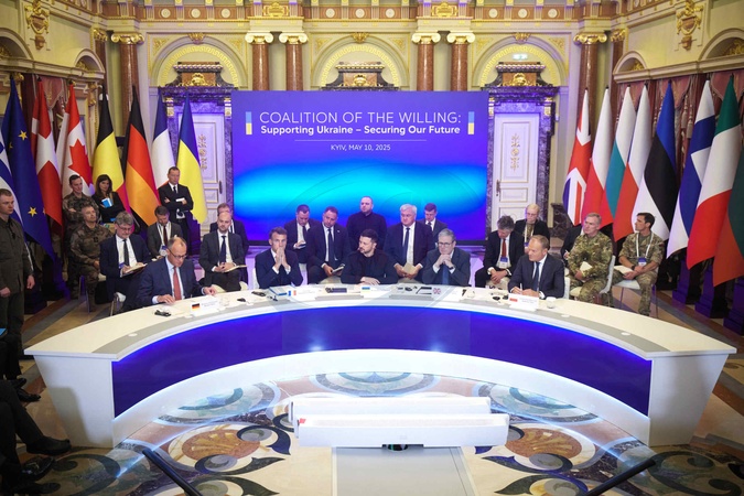 Déplacement d'Emmanuel Macron, Friedrich Merz, Keir Starmer, Donald Tusk et Voloydmyr Zelensky pour participer à la conférence de la Coalition des Volontaires à Kiev, le 10 mai 2025. A l'issue de celle-ci, Emmanuel Macron, Keir Starmer, et Voloydmyr Zelensky ont visité le Mur des Héros de la Nation et la cathédrale Sainte-Sophie. Lors de cette visite officielle, les quatre chefs d'État et de gouvernement ont plaidé en faveur d'un cessez-le-feu de 30 jours dans la guerre russo-ukrainienne. Emmanuel Macron, Friedrich Merz, Keir Starmer, Donald Tusk, and Voloydmyr Zelensky travel to attend the Coalition of the Willing conference in Kyiv on May 10, 2025. Following the conference, Emmanuel Macron, Keir Starmer, and Voloydmyr Zelensky visited the Wall of the Nation's Heroes and Saint Sophia Cathedral. During this official visit, the four heads of state and government called for a 30-day ceasefire in the Russo-Ukrainian war.