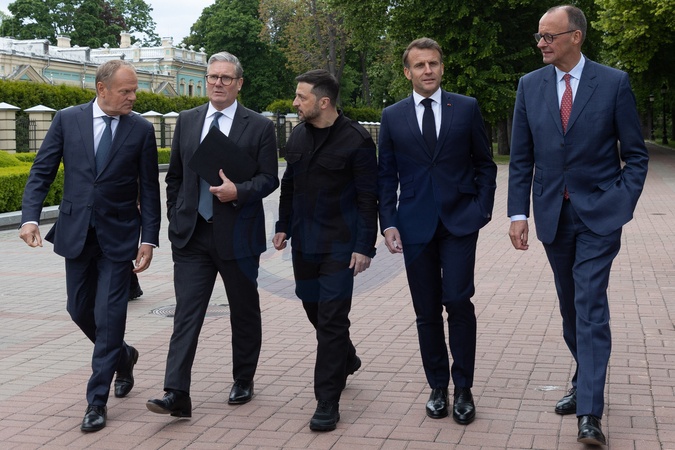 Déplacement d'Emmanuel Macron, Friedrich Merz, Keir Starmer, Donald Tusk et Voloydmyr Zelensky pour participer à la conférence de la Coalition des Volontaires à Kiev, le 10 mai 2025. A l'issue de celle-ci, Emmanuel Macron, Keir Starmer, et Voloydmyr Zelensky ont visité le Mur des Héros de la Nation et la cathédrale Sainte-Sophie. Lors de cette visite officielle, les quatre chefs d'État et de gouvernement ont plaidé en faveur d'un cessez-le-feu de 30 jours dans la guerre russo-ukrainienne. Emmanuel Macron, Friedrich Merz, Keir Starmer, Donald Tusk, and Voloydmyr Zelensky travel to attend the Coalition of the Willing conference in Kyiv on May 10, 2025. Following the conference, Emmanuel Macron, Keir Starmer, and Voloydmyr Zelensky visited the Wall of the Nation's Heroes and Saint Sophia Cathedral. During this official visit, the four heads of state and government called for a 30-day ceasefire in the Russo-Ukrainian war.