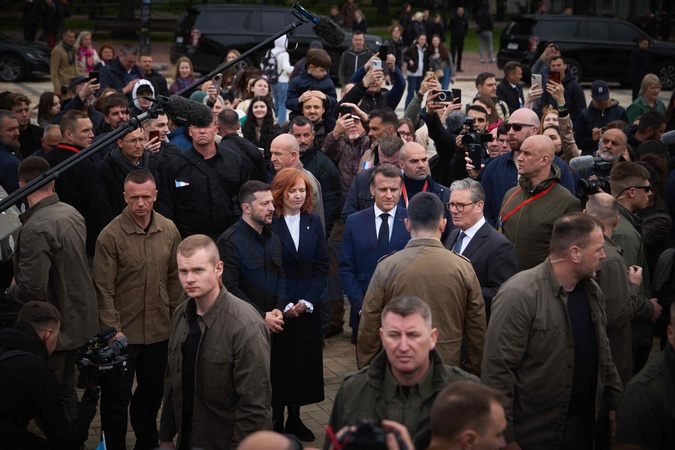 Déplacement d'Emmanuel Macron, Friedrich Merz, Keir Starmer, Donald Tusk et Voloydmyr Zelensky pour participer à la conférence de la Coalition des Volontaires à Kiev, le 10 mai 2025. A l'issue de celle-ci, Emmanuel Macron, Keir Starmer, et Voloydmyr Zelensky ont visité le Mur des Héros de la Nation et la cathédrale Sainte-Sophie. Lors de cette visite officielle, les quatre chefs d'État et de gouvernement ont plaidé en faveur d'un cessez-le-feu de 30 jours dans la guerre russo-ukrainienne. Emmanuel Macron, Friedrich Merz, Keir Starmer, Donald Tusk, and Voloydmyr Zelensky travel to attend the Coalition of the Willing conference in Kyiv on May 10, 2025. Following the conference, Emmanuel Macron, Keir Starmer, and Voloydmyr Zelensky visited the Wall of the Nation's Heroes and Saint Sophia Cathedral. During this official visit, the four heads of state and government called for a 30-day ceasefire in the Russo-Ukrainian war.