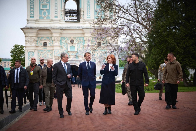Déplacement d'Emmanuel Macron, Friedrich Merz, Keir Starmer, Donald Tusk et Voloydmyr Zelensky pour participer à la conférence de la Coalition des Volontaires à Kiev, le 10 mai 2025. A l'issue de celle-ci, Emmanuel Macron, Keir Starmer, et Voloydmyr Zelensky ont visité le Mur des Héros de la Nation et la cathédrale Sainte-Sophie. Lors de cette visite officielle, les quatre chefs d'État et de gouvernement ont plaidé en faveur d'un cessez-le-feu de 30 jours dans la guerre russo-ukrainienne. Emmanuel Macron, Friedrich Merz, Keir Starmer, Donald Tusk, and Voloydmyr Zelensky travel to attend the Coalition of the Willing conference in Kyiv on May 10, 2025. Following the conference, Emmanuel Macron, Keir Starmer, and Voloydmyr Zelensky visited the Wall of the Nation's Heroes and Saint Sophia Cathedral. During this official visit, the four heads of state and government called for a 30-day ceasefire in the Russo-Ukrainian war.