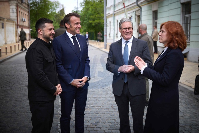 Déplacement d'Emmanuel Macron, Friedrich Merz, Keir Starmer, Donald Tusk et Voloydmyr Zelensky pour participer à la conférence de la Coalition des Volontaires à Kiev, le 10 mai 2025. A l'issue de celle-ci, Emmanuel Macron, Keir Starmer, et Voloydmyr Zelensky ont visité le Mur des Héros de la Nation et la cathédrale Sainte-Sophie. Lors de cette visite officielle, les quatre chefs d'État et de gouvernement ont plaidé en faveur d'un cessez-le-feu de 30 jours dans la guerre russo-ukrainienne. Emmanuel Macron, Friedrich Merz, Keir Starmer, Donald Tusk, and Voloydmyr Zelensky travel to attend the Coalition of the Willing conference in Kyiv on May 10, 2025. Following the conference, Emmanuel Macron, Keir Starmer, and Voloydmyr Zelensky visited the Wall of the Nation's Heroes and Saint Sophia Cathedral. During this official visit, the four heads of state and government called for a 30-day ceasefire in the Russo-Ukrainian war.