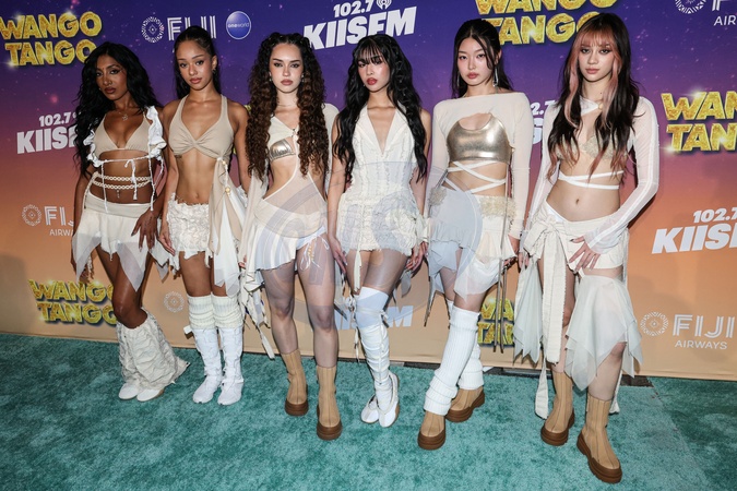 HUNTINGTON BEACH, ORANGE COUNTY, CALIFORNIA, USA - MAY 10: Lara Raj, Manon Bannerman, Daniela Avanzini, Sophia Laforteza, Jeung Yoon-chae and Megan Skiendiel of American girl group KATSEYE arrive at iHeartRadio's 102.7 KIIS FM Wango Tango 2025 Presented by Fiji Airways held at the Huntington City Beach on May 10, 2025 in Huntington Beach, Orange County, California, United States., Credit:Xavier Collin / Avalon
