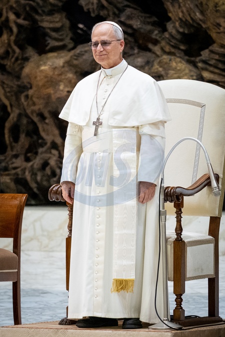 Pope Leo XIV meets members of the international media in the Paul VI Hall in Vatican City, Vatican, on 12 May 2025., Credit:Stefano Costantino TTL / Avalon