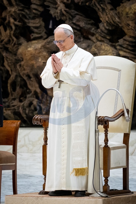 Pope Leo XIV meets members of the international media in the Paul VI Hall in Vatican City, Vatican, on 12 May 2025., Credit:Stefano Costantino TTL / Avalon