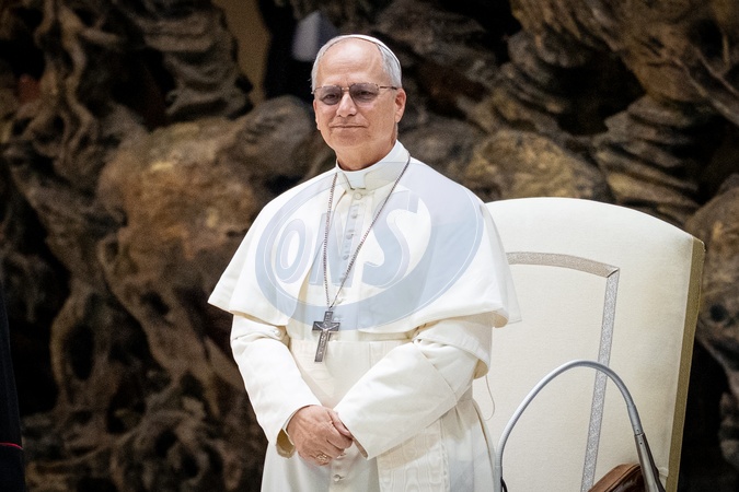 Pope Leo XIV meets members of the international media in the Paul VI Hall in Vatican City, Vatican, on 12 May 2025.
