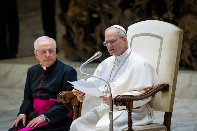 Pope Leo XIV meets members of the international media in the Paul VI Hall in Vatican City, Vatican, on 12 May 2025., Credit:Stefano Costantino TTL / Avalon