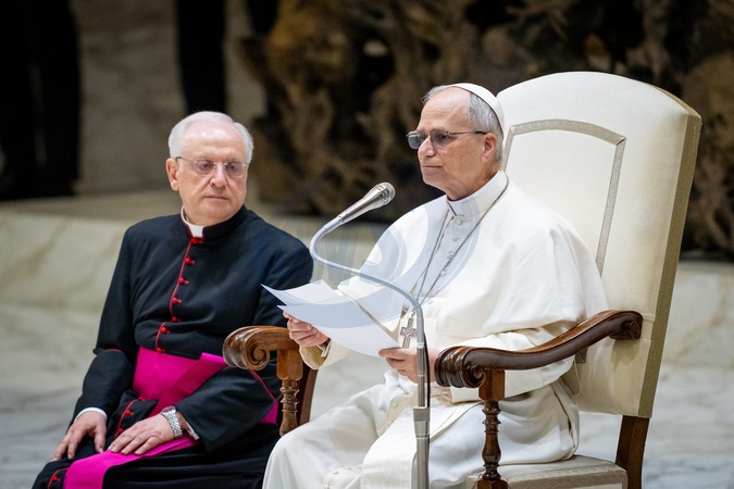 Pope Leo XIV meets members of the international media in the Paul VI Hall in Vatican City, Vatican, on 12 May 2025.