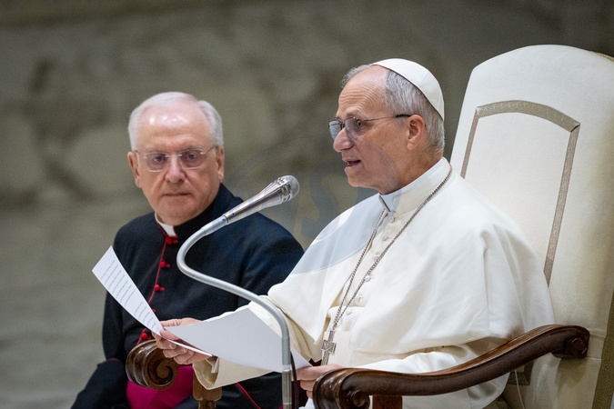 Pope Leo XIV meets members of the international media in the Paul VI Hall in Vatican City, Vatican, on 12 May 2025.