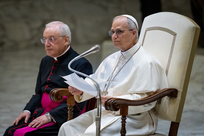 Pope Leo XIV meets members of the international media in the Paul VI Hall in Vatican City, Vatican, on 12 May 2025., Credit:Stefano Costantino TTL / Avalon