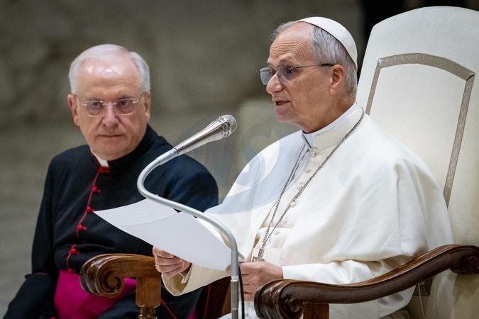 Pope Leo XIV meets members of the international media in the Paul VI Hall in Vatican City, Vatican, on 12 May 2025., Credit:Stefano Costantino TTL / Avalon