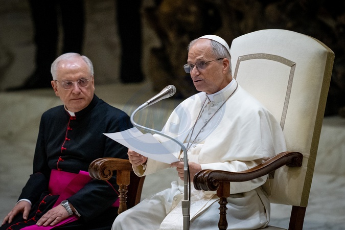 Pope Leo XIV meets members of the international media in the Paul VI Hall in Vatican City, Vatican, on 12 May 2025.