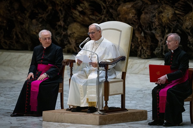 Pope Leo XIV meets members of the international media in the Paul VI Hall in Vatican City, Vatican, on 12 May 2025.