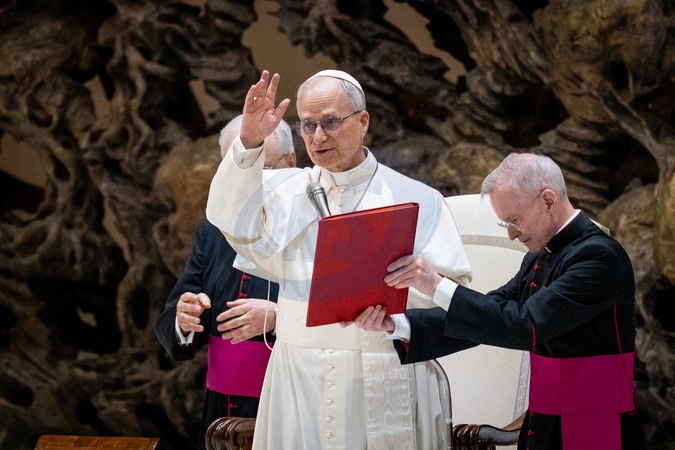 Pope Leo XIV meets members of the international media in the Paul VI Hall in Vatican City, Vatican, on 12 May 2025.