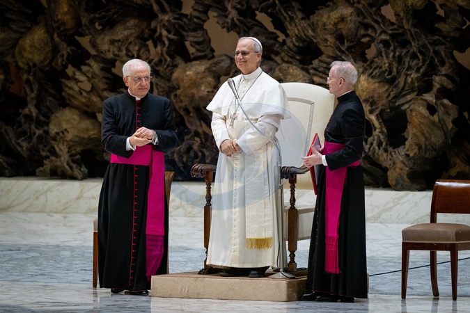 Pope Leo XIV meets members of the international media in the Paul VI Hall in Vatican City, Vatican, on 12 May 2025.