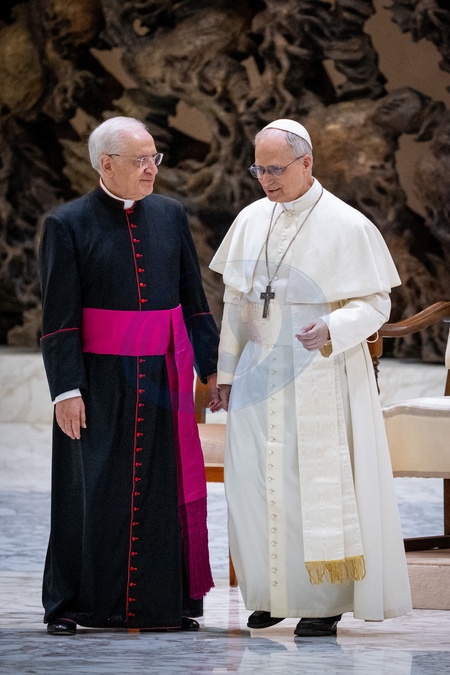 Papież Leon XIV spotyka się z przedstawicielami mediów międzynarodowych w Auli Pawła VI w Watykanie, 12 maja 2025 r.