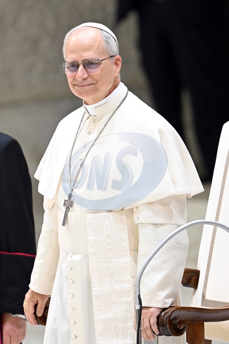Papież Leon XIV spotyka się z mediami w Auli Pawła VI w Watykanie, Rzym. 12 maja 2025 r.