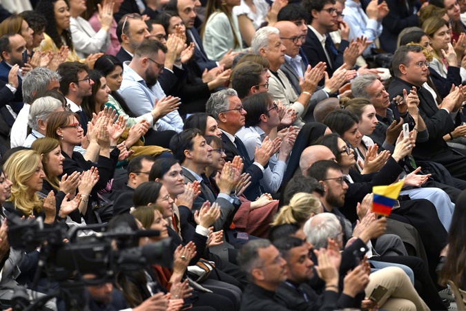 Papież Leon XIV spotyka się z mediami w Auli Pawła VI w Watykanie, Rzym. 12 maja 2025 r.