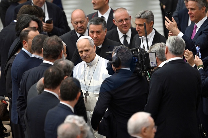 Papież Leon XIV spotyka się z mediami w Auli Pawła VI w Watykanie, Rzym. 12 maja 2025 r.