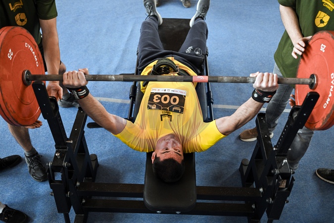 An athlete performs barbell bench press during the UNBROKEN GAMES for the Ukrainian military and veterans, Lviv, Ukraine, on May 10, 2025. (Photo by Anastasiia Smolienko/Ukrinform), Credit:Anastasiia Smolienko / Avalon