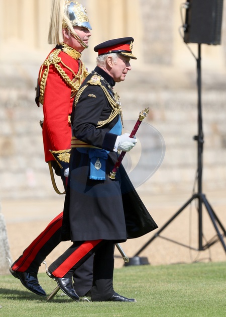 WINDSOR, ENGLAND - MAY 12: King Charles III arrives for the presentation of the New Standards at Windsor Castle on May 12, 2025 in Windsor, England. The King, accompanied by The Princess Royal, will attend the Household Cavalry's New Standards Parade at Windsor Castle on Monday, 12th May. The Standards, deeply symbolic of the Squadrons' heritage and achievements, are held in the highest esteem., Credit:Chris Jackson / Avalon