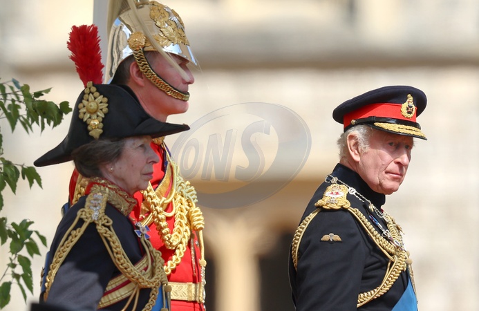 WINDSOR, ENGLAND - MAY 12: King Charles III and Anne, Princess Royal (L) inspect the parade at the presentation of the New Standards at Windsor Castle on May 12, 2025 in Windsor, England. The King, accompanied by The Princess Royal, will attend the Household Cavalry's New Standards Parade at Windsor Castle on Monday, 12th May. The Standards, deeply symbolic of the Squadrons' heritage and achievements, are held in the highest esteem., Credit:Chris Jackson / Avalon