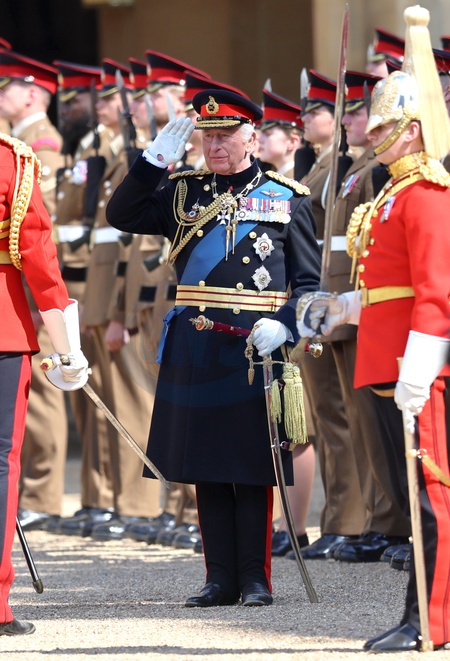 WINDSOR, ENGLAND - MAY 12: King Charles III salutes military personnel during the presentation of the New Standards at Windsor Castle on May 12, 2025 in Windsor, England. The King, accompanied by The Princess Royal, will attend the Household Cavalry's New Standards Parade at Windsor Castle on Monday, 12th May. The Standards, deeply symbolic of the Squadrons' heritage and achievements, are held in the highest esteem., Credit:Chris Jackson / Avalon