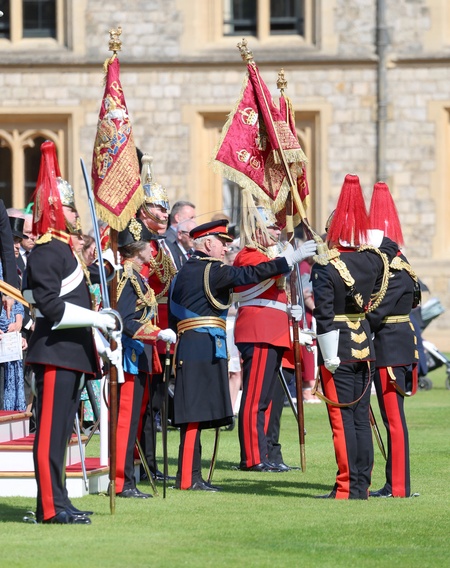 WINDSOR, ENGLAND - MAY 12: King Charles III with the Sovereign's Standards during the presentation of the New Standards at Windsor Castle on May 12, 2025 in Windsor, England. The King, accompanied by The Princess Royal, will attend the Household Cavalry's New Standards Parade at Windsor Castle on Monday, 12th May. The Standards, deeply symbolic of the Squadrons' heritage and achievements, are held in the highest esteem., Credit:Chris Jackson / Avalon