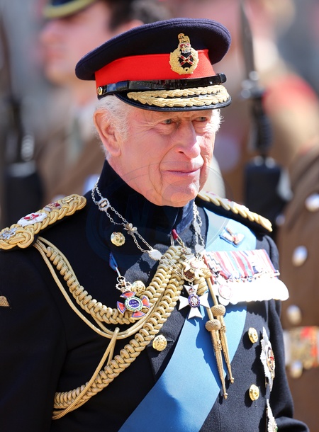 WINDSOR, ENGLAND - MAY 12: King Charles III smiles during the presentation of the New Standards at Windsor Castle on May 12, 2025 in Windsor, England. The King, accompanied by The Princess Royal, will attend the Household Cavalry's New Standards Parade at Windsor Castle on Monday, 12th May. The Standards, deeply symbolic of the Squadrons' heritage and achievements, are held in the highest esteem., Credit:Chris Jackson / Avalon