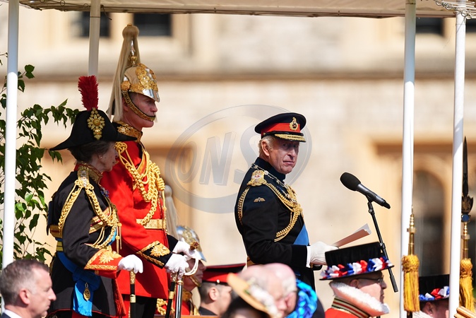 King Charles III, Colonel in Chief, The Household Cavalry, and the Princess Royal, Colonel The Blues and Royals, attending the presentation of new standards to The Life Guards and the Blues and Royals at Windsor Castle, Berkshire., Credit:Aaron Chown / Avalon