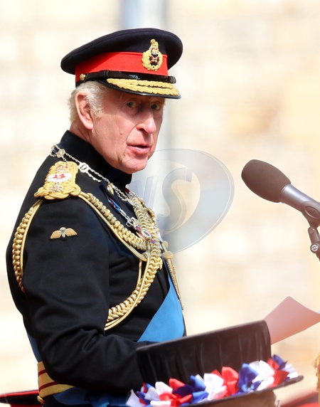WINDSOR, ENGLAND - MAY 12: King Charles III address the parade during the presentation of the New Standards at Windsor Castle on May 12, 2025 in Windsor, England. The King, accompanied by The Princess Royal, will attend the Household Cavalry's New Standards Parade at Windsor Castle on Monday, 12th May. The Standards, deeply symbolic of the Squadrons' heritage and achievements, are held in the highest esteem., Credit:Chris Jackson / Avalon