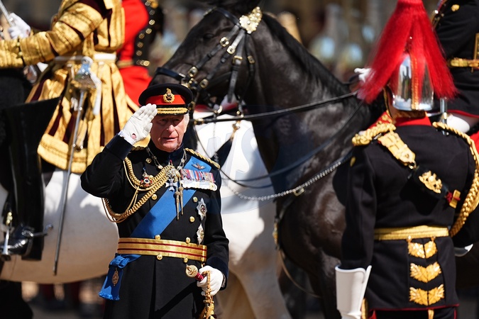 King Charles III, Colonel in Chief, The Household Cavalry, attending the presentation of new standards to The Life Guards and the Blues and Royals at Windsor Castle, Berkshire., Credit:Aaron Chown / Avalon