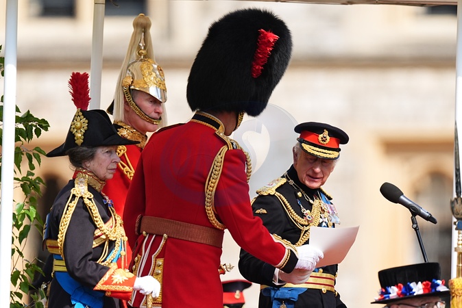 King Charles III, Colonel in Chief, The Household Cavalry, attending the presentation of new standards to The Life Guards and the Blues and Royals at Windsor Castle, Berkshire., Credit:Aaron Chown / Avalon