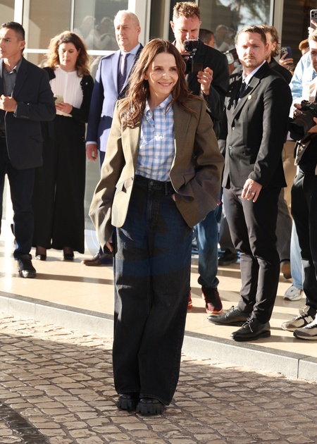 La Présidente du Jury Juliette Binoche à son arrivée à l'hotel Martinez la veille de l'ouverture du 78ème Festival International du Film de Cannes, le 12 mai 2025. © Denis Guignebourg/Bestimage Celebrities arrive at the Martinez Hotel during the 78th Cannes International Film Festival